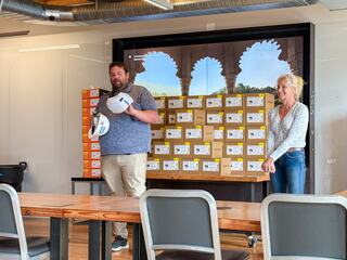 Jennifer Putnam-Petrone, right, shares more about the benefits of Type II safety helmets with employees at an event last year.
