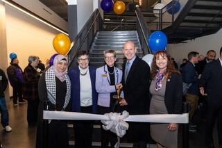 Leaders from University of Washington Bothell and Cascadia College celebrate Innovation Hall’s opening in November 2023. Left to right: Azizeh Farajallah, Cascadia College chemistry professor; UW President Ana Mari Cauce; Kristin Esterberg, chancellor of UW Bothell; Cascadia College President Eric Murray; and Leslie Cornick, dean of the UW Bothell School of STEM. Photo courtesy of University of Washington Bothell.