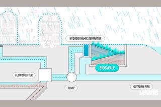 Water moves through the existing infrastructure of the basin until just above Portage Bay, where the team installed a flow splitter to reroute stormwater into the new GSI. Once the stormwater enters the new system, it flows through a hydrodynamic separator that removes solids like leaves and trash to prevent the bioswale from flooding, then is pumped up into the swale itself to be cleaned.