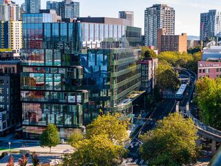 The offset massing, stacked vertically along the northwest corner, acknowledges the sculptural forms of the nearby Museum of Pop Culture (MoPOP), while the curvature of the facade—mirroring the skate park below—reflects the flow of pedestrian and cyclist traffic. The rooftop deck and a green roof provide sweeping views of the Space Needle and Seattle skyline.