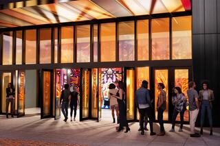 The space includes a lobby, stage, dressing rooms, bars, stadium seating, mezzanine, loading docks and support areas. An existing basement adds unoccupiable square footage to the footprint of approximately 54,000 square feet.