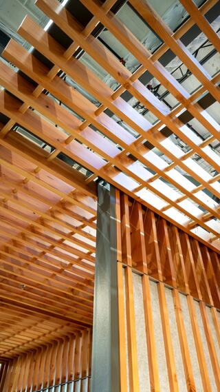 These wooden slats can be found in “nodes” built along the North Valley Complex’s circulation paths, adding warmth to amenity spaces while also helping to bring human scale to the 175,000-square-foot building.